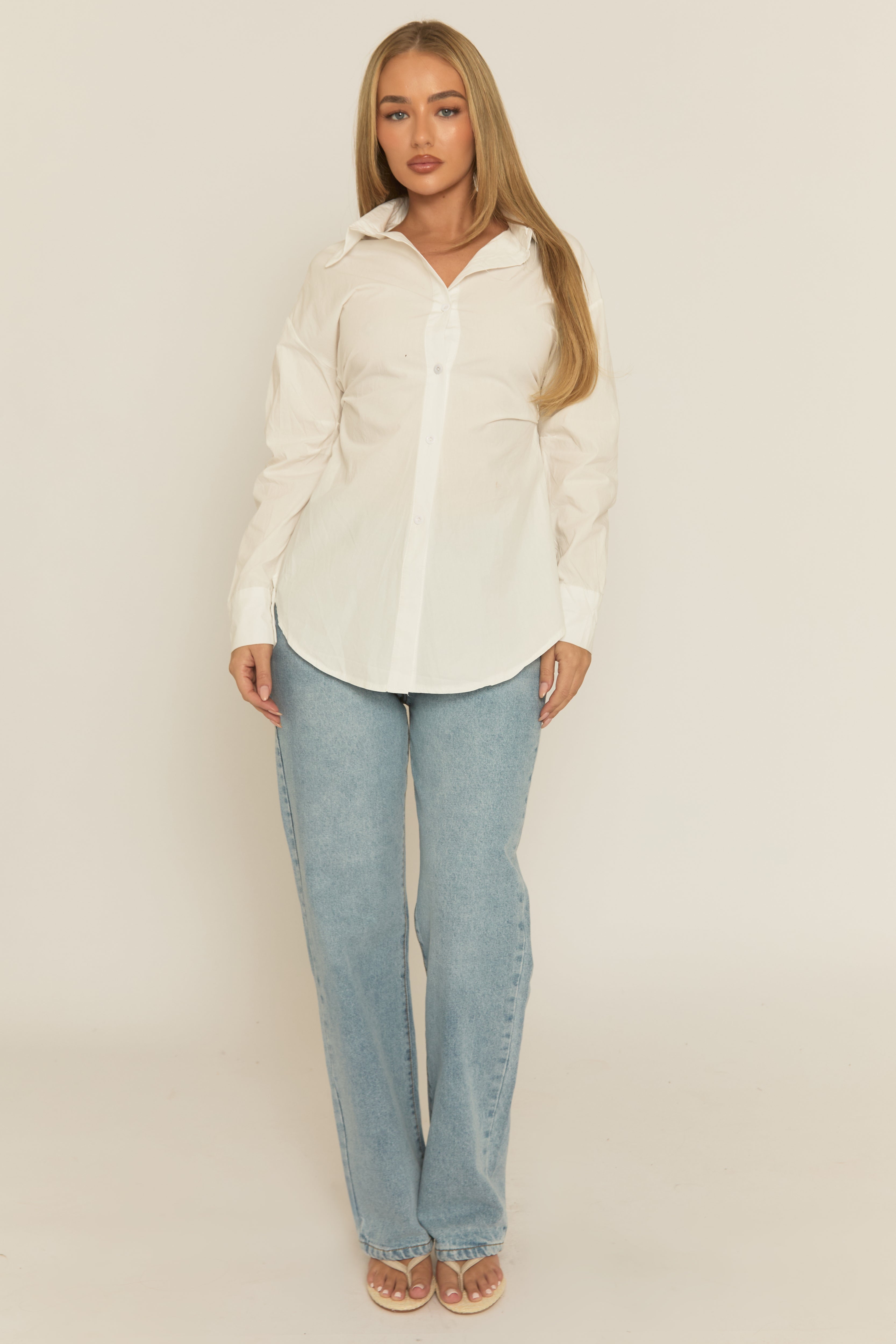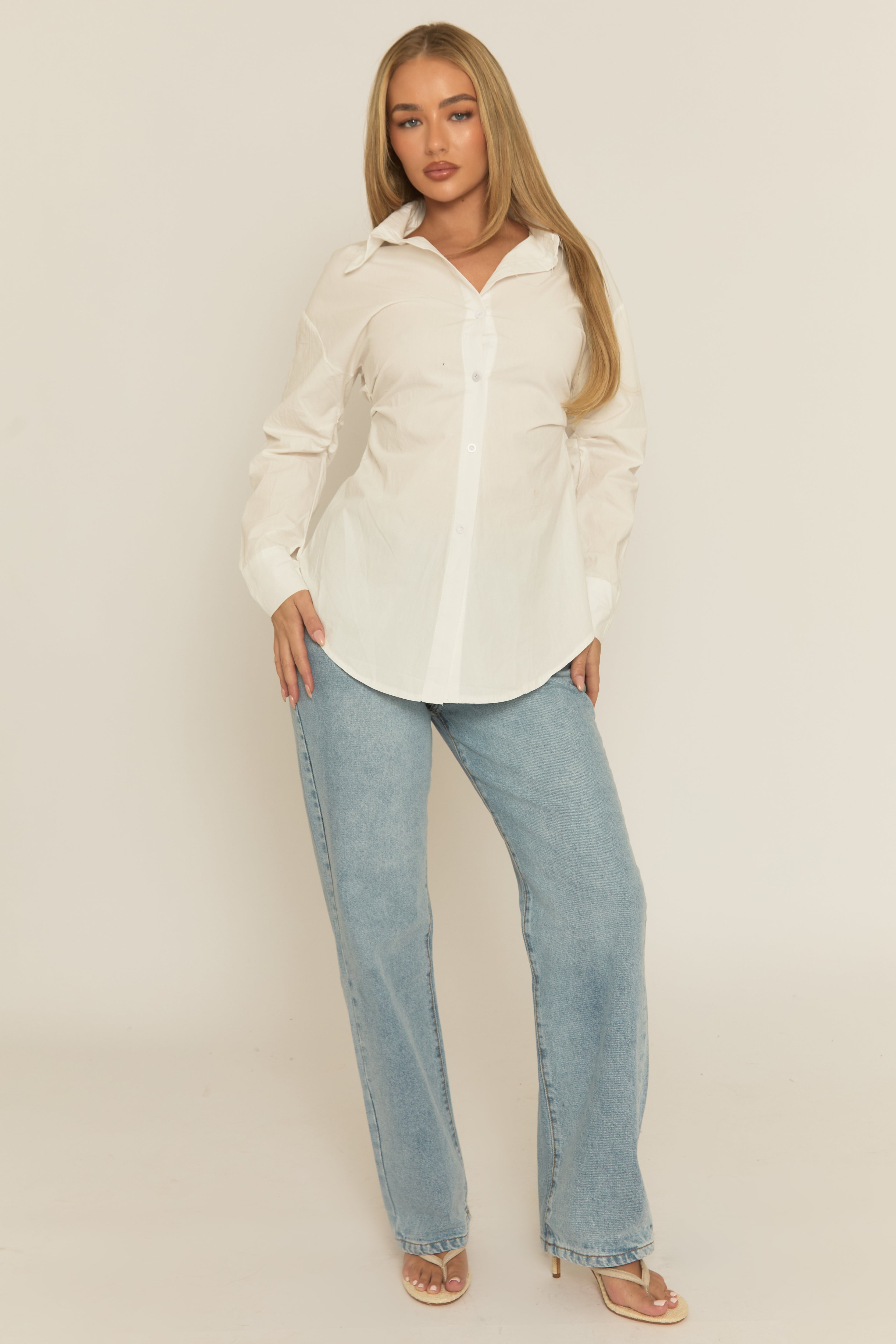 On point styling in our White Cinched Waist Long Sleeve Shirt. Featuring a woven fabric, button up front design, cinched waist detail, curved hem and long sleeves. Embrace the season's trends with our thoughtfully curated pieces that are perfect for mixing and matching, allowing you to create countless outfit combinations. Style with denim and heels for a head turning look.