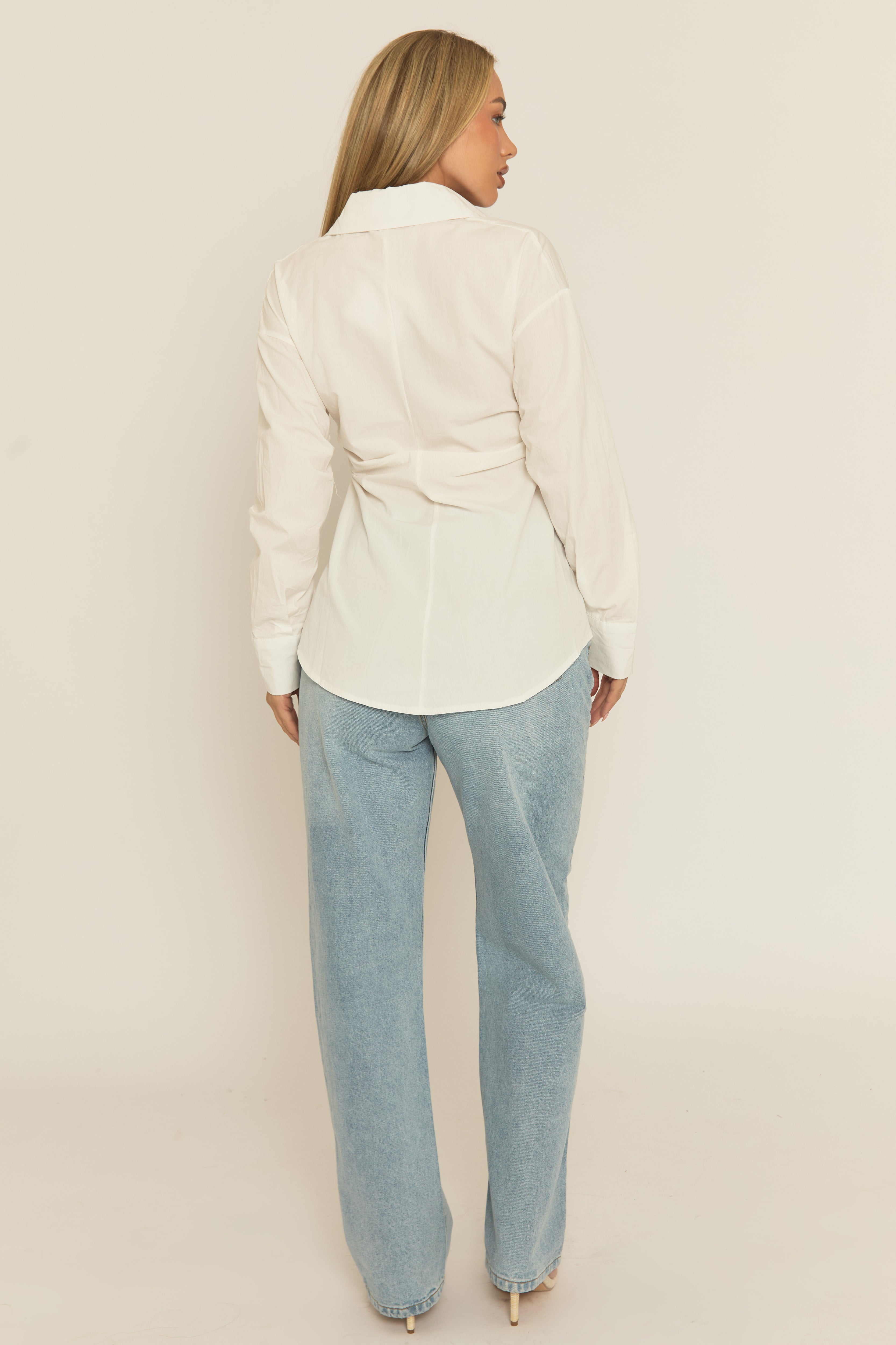 White Cinched Waist Long Sleeve Shirt - Tarla