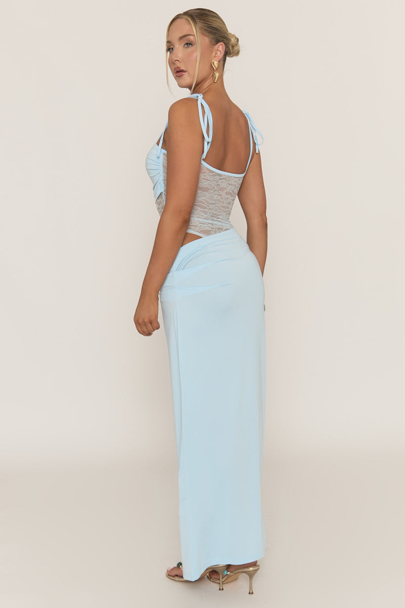 How unreal is this Blue Lace Insert Maxi Dress. Featuring a jersey fabric with built in lace bodysuit, cut out waist detailing, tie shoulder straps and maxi length. Embrace the season's trends with our thoughtfully curated pieces that are perfect for mixing and matching, allowing you to create countless outfit combinations. Add accessories of your choice to complete.