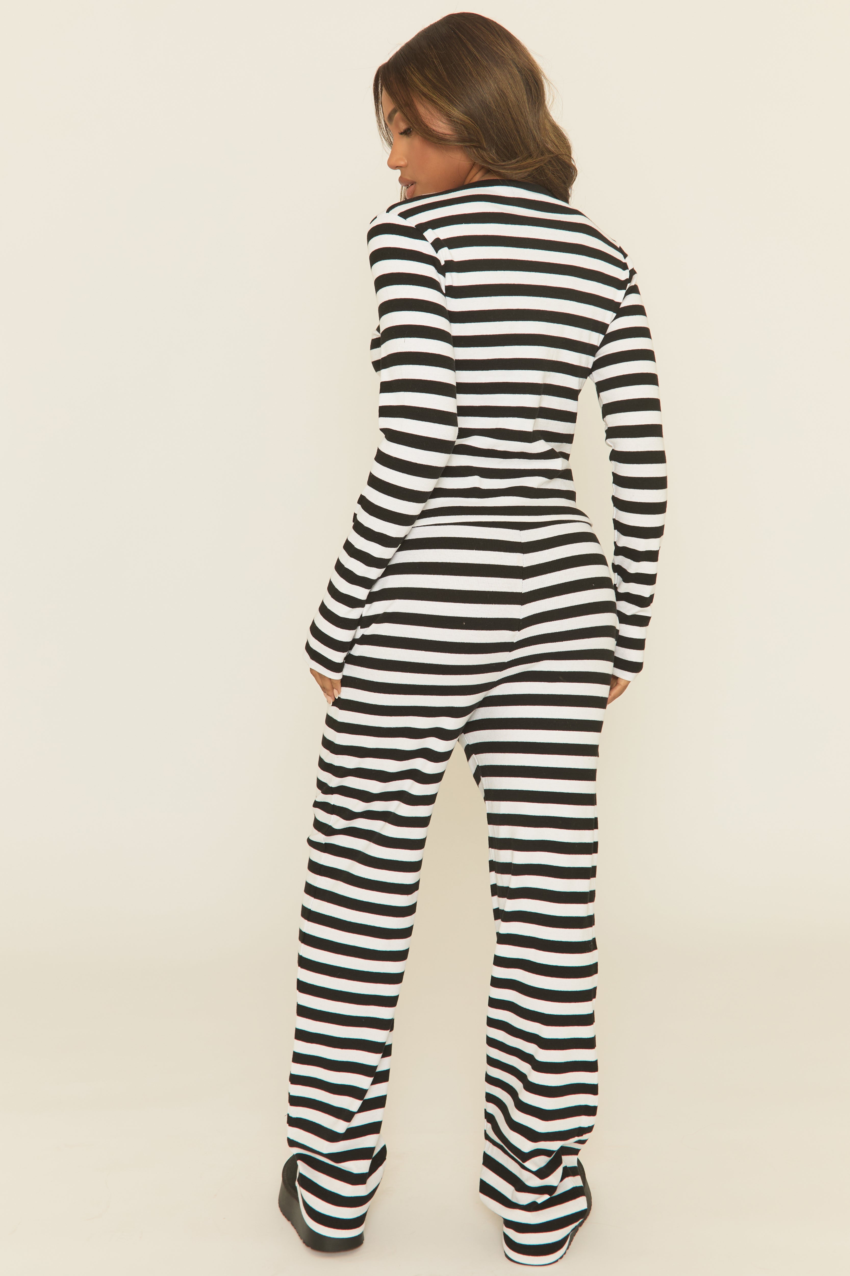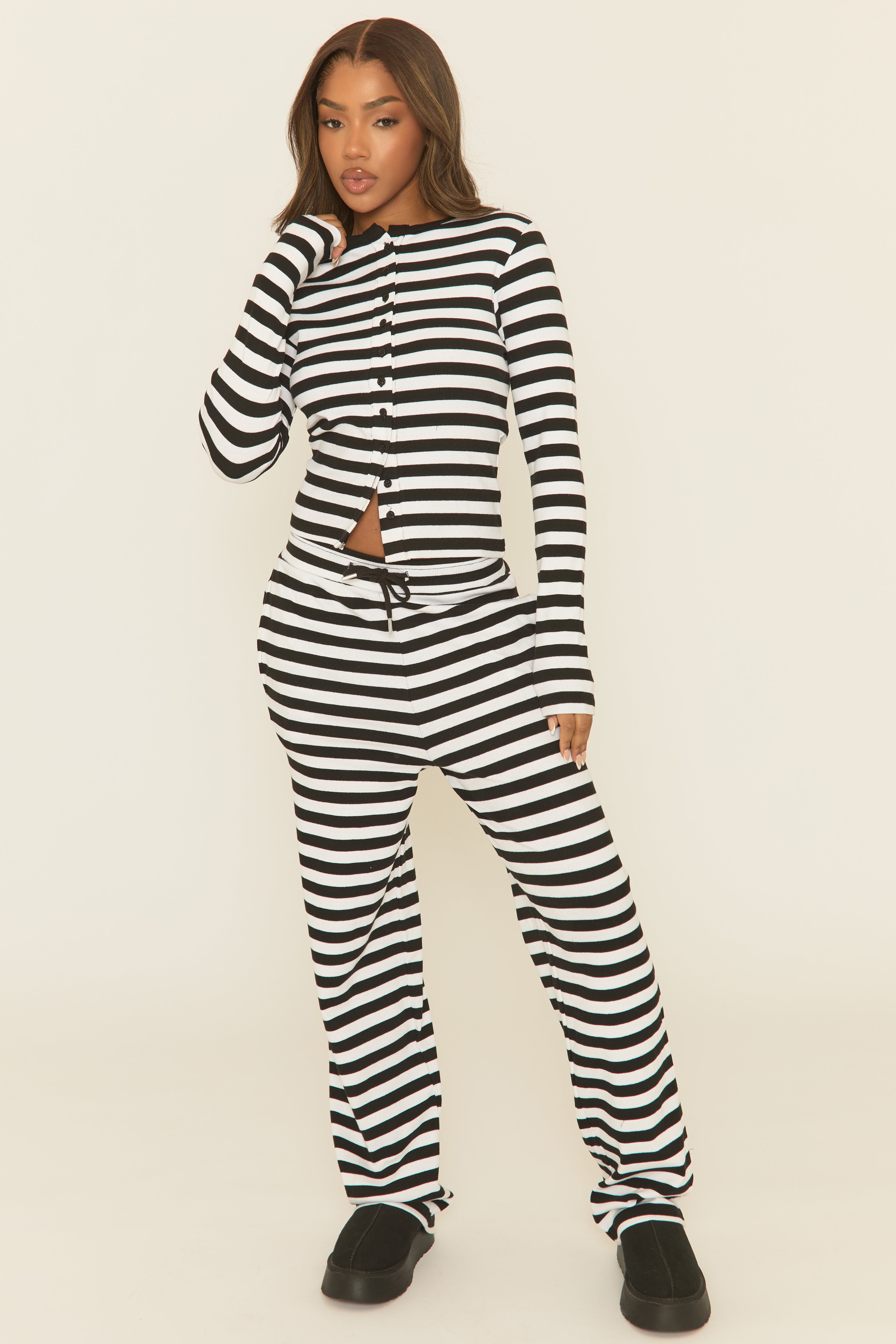 New lounge for new season with this Black Stripe Button Front Long Sleeve Top and Trouser Loungewear Set. Featuring a rib fabric, button detail, long sleeve top and matching drawstring waist trousers. Embrace the season's trends with our thoughtfully curated pieces that are perfect for mixing and matching, allowing you to create countless outfit combinations. Add accessories of your choice to finish.