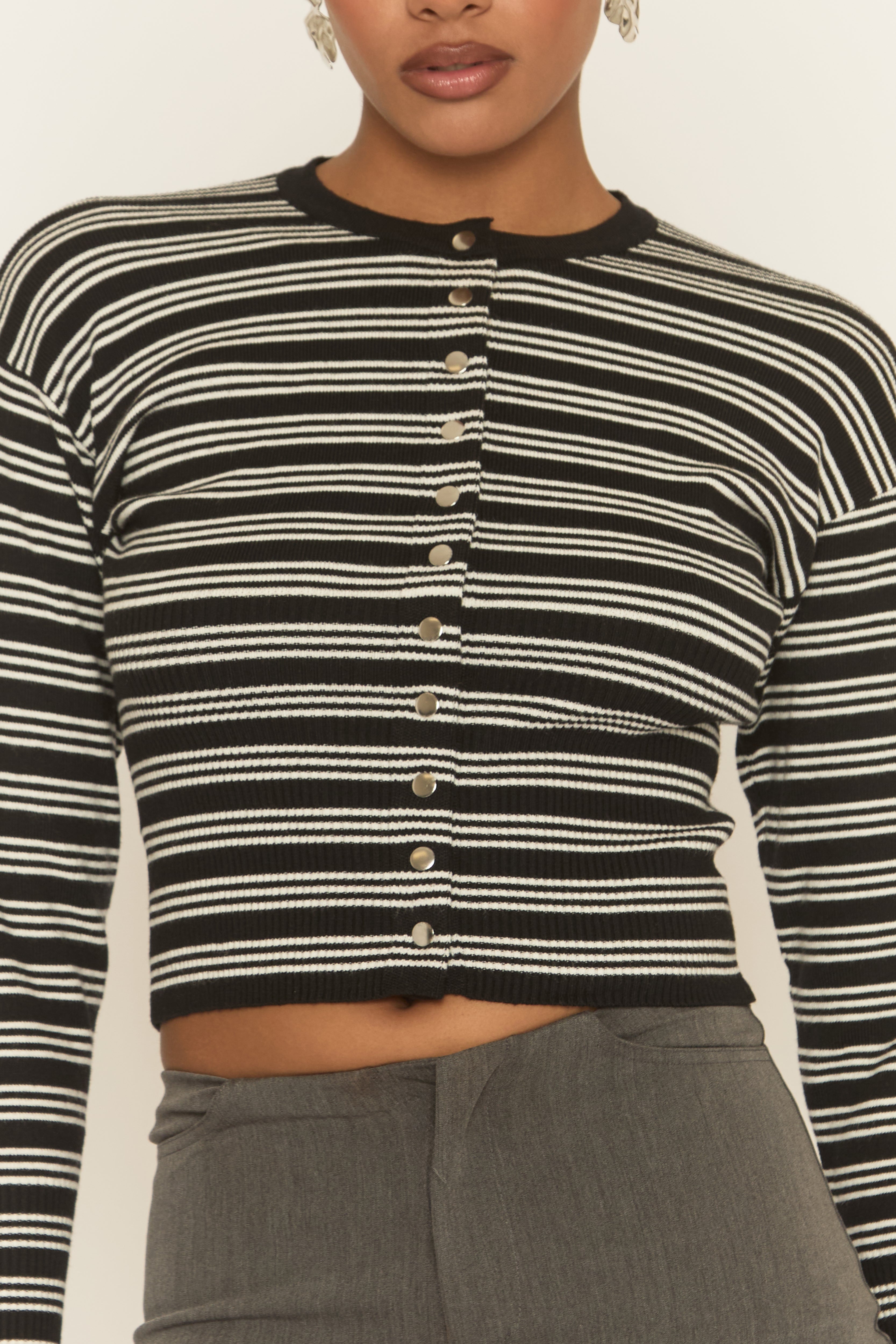 Black Striped Knit Cinched Waist Cardigan - Melita