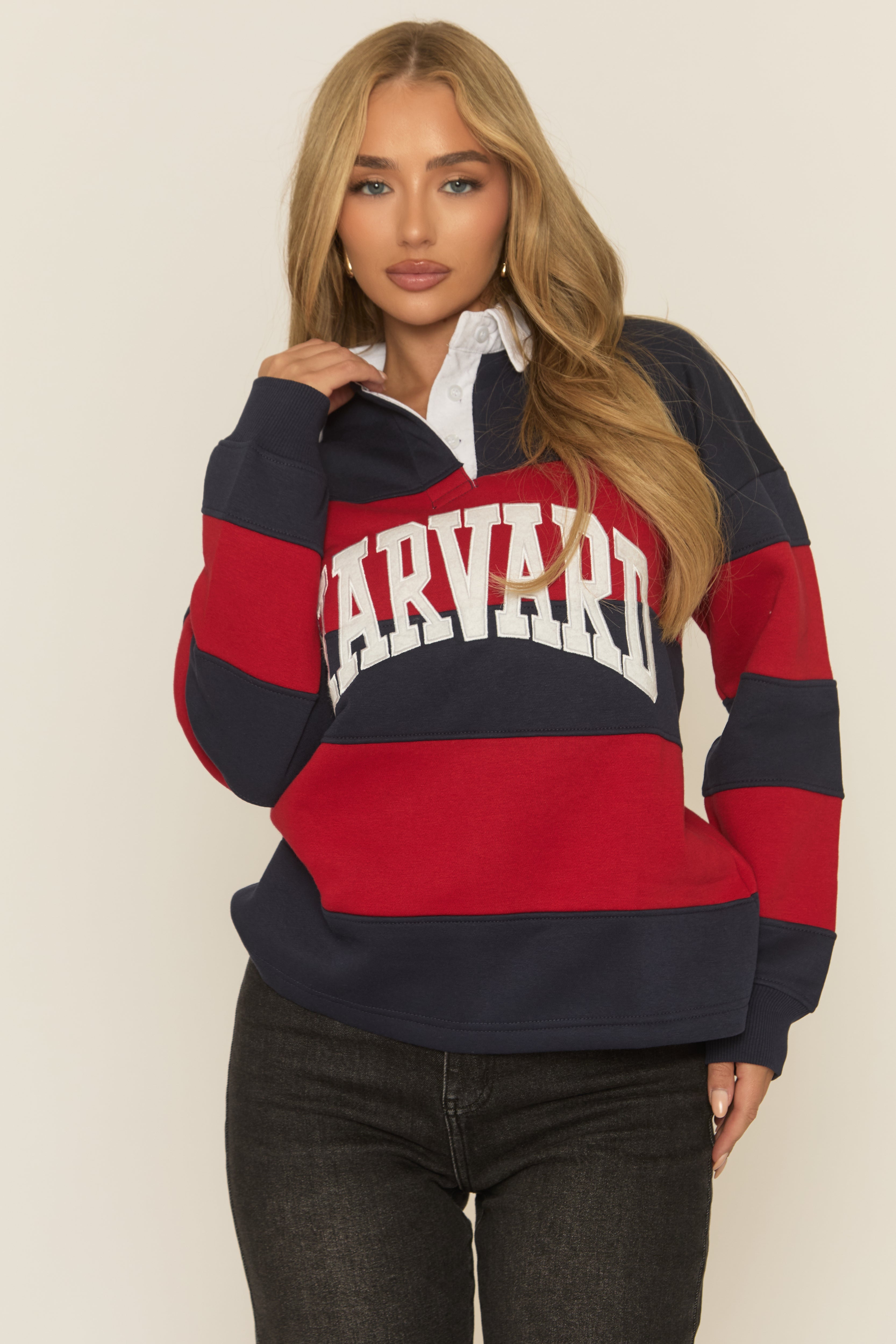 Effortless style in our Navy Stripe Slogan Collared Sweater. Featuring a striped jersey fabric, contrasting collared design with embroidered Harvard slogan and relaxed fit. Embrace the season's trends with our thoughtfully curated pieces that are perfect for mixing and matching, allowing you to create countless outfit combinations. Add denim and boots for a chic finish.