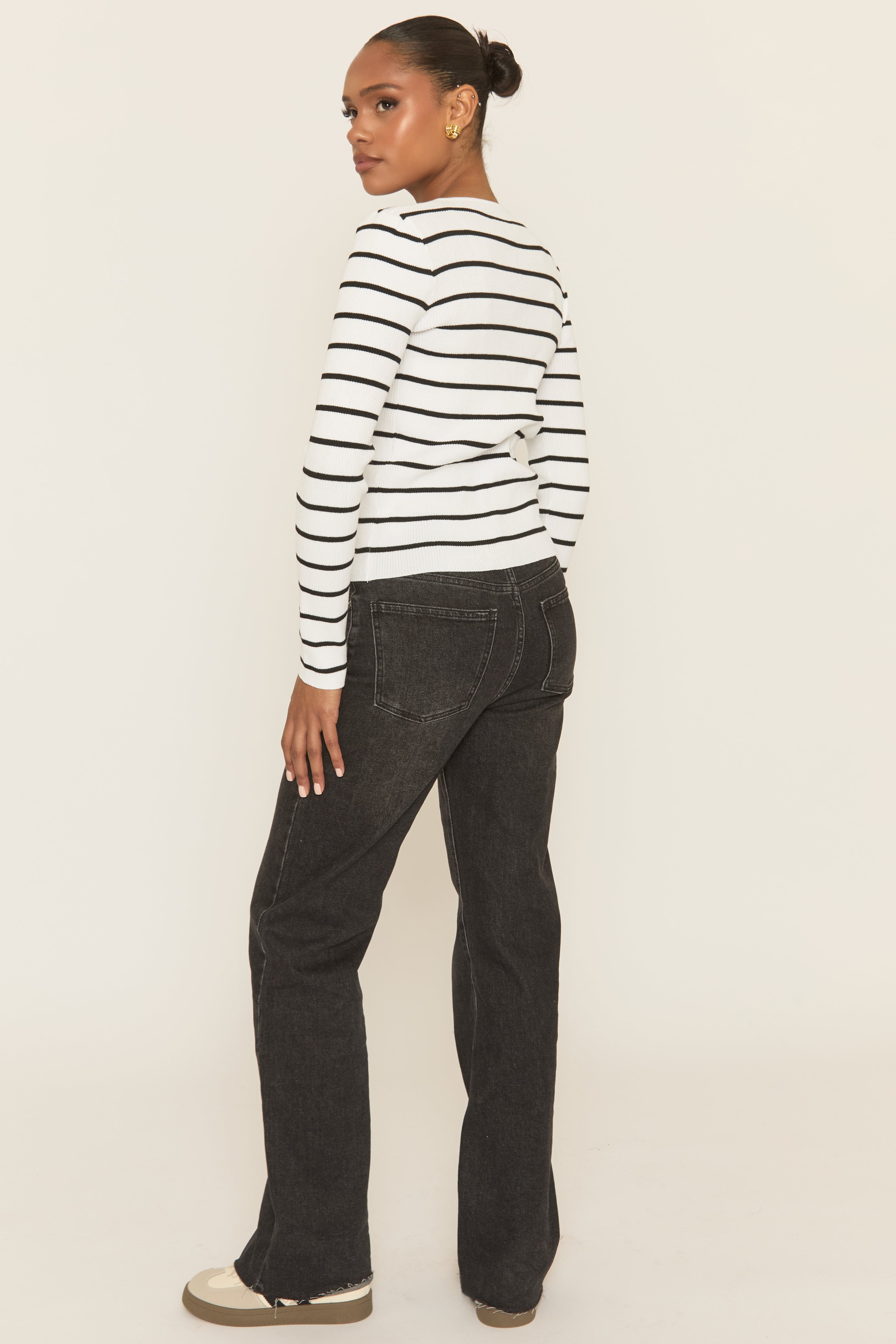 This seasons staple with our White Striped Rib Knit Button up Top. Featuring a ribbed stripe fabric, long sleeve design with button up front and collarless detail. Embrace the season's trends with our thoughtfully curated pieces that are perfect for mixing and matching, allowing you to create countless outfit combinations. Wear with denim and boots for off-duty.