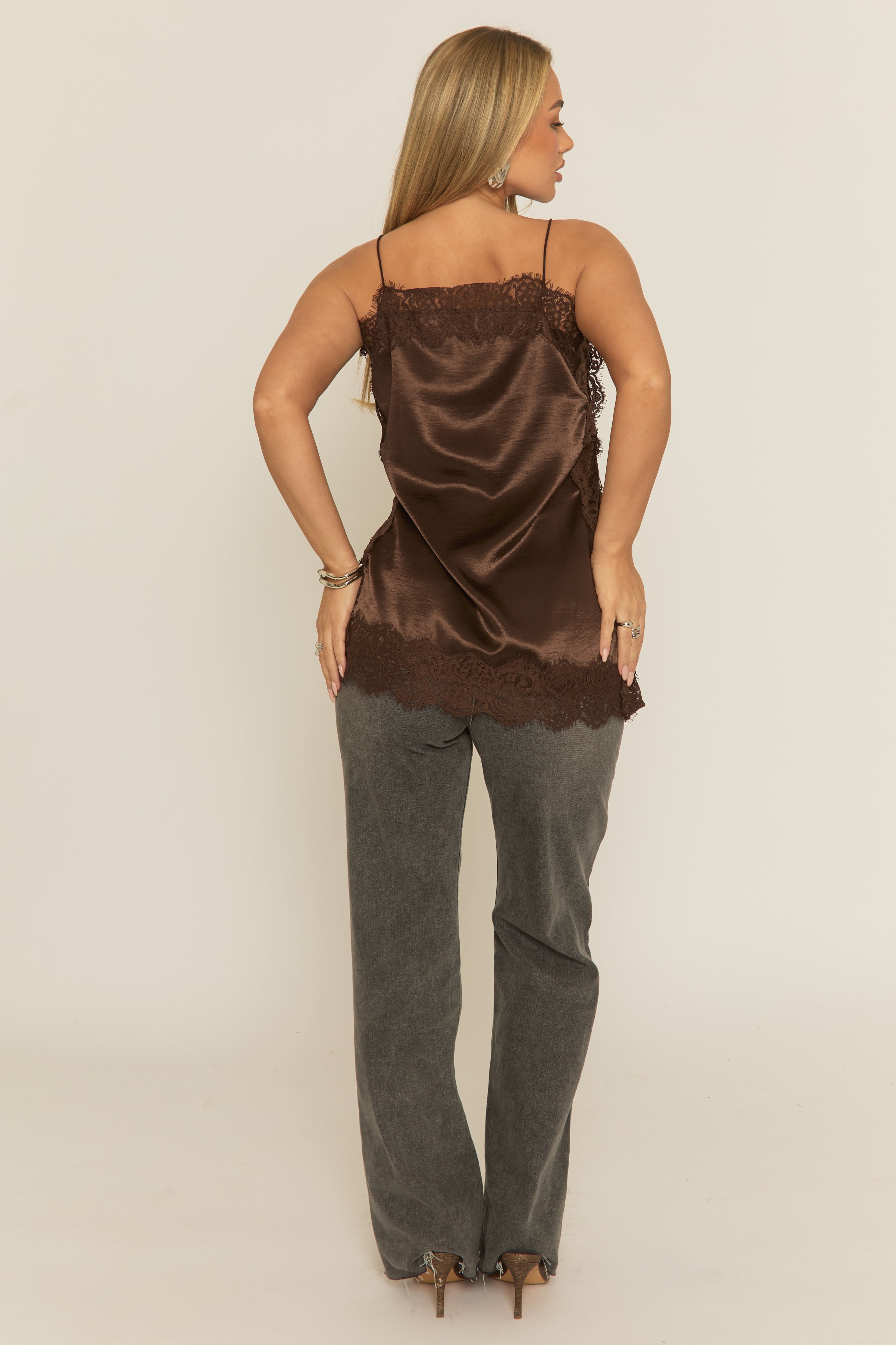 Date night vibes in our Chocolate Lace Trim Satin Cami Top. Featuring a satin fabric with strappy design and lace trim detail. Embrace the season's trends with our thoughtfully curated pieces that are perfect for mixing and matching, allowing you to create countless outfit combinations. Add denim and heels to complete.