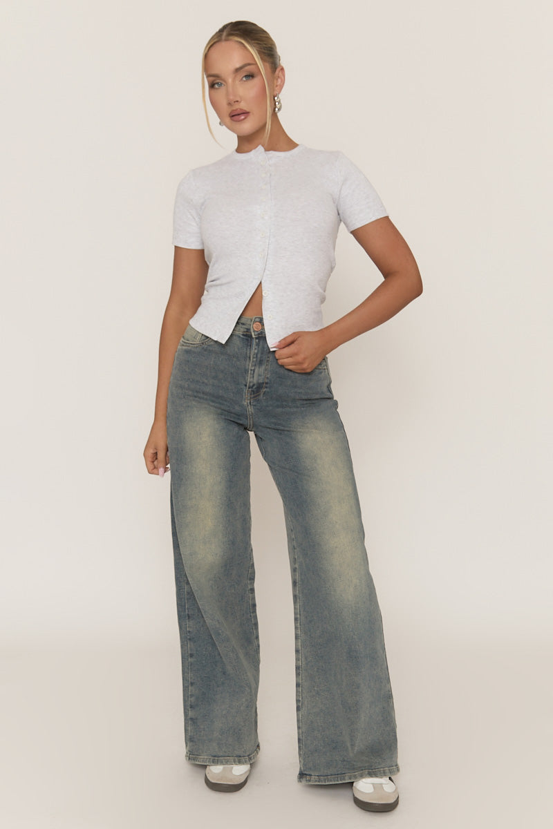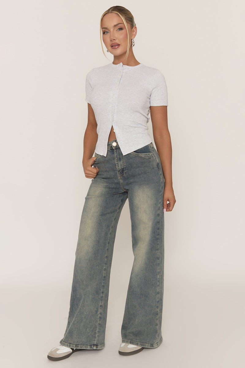 Grey Short Sleeve Button Front Rib Top