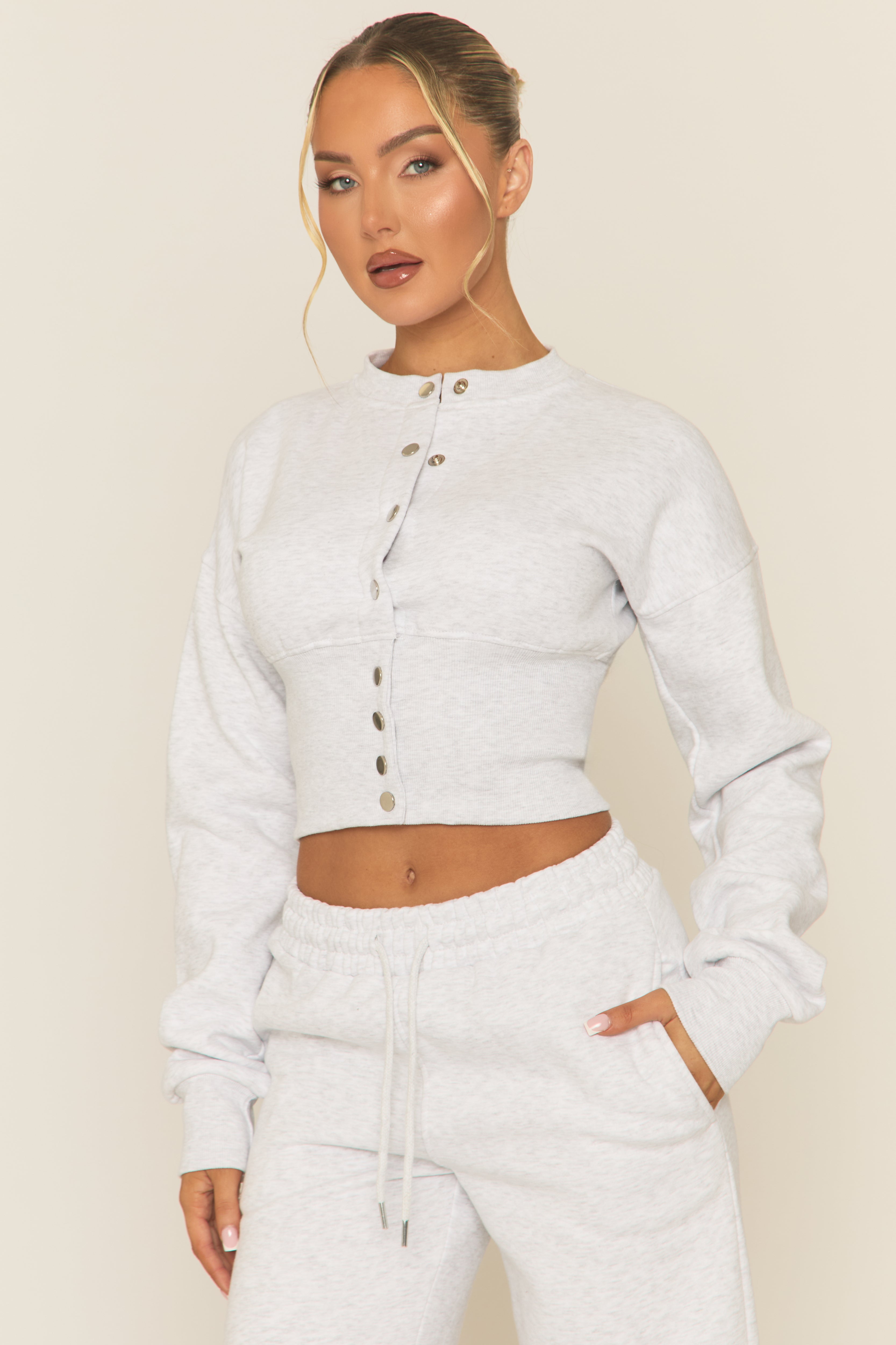 Bleach Grey Popper Front Cinched Waist Sweatshirt and Wide Leg Trousers Loungewear Co-ord Set