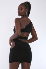 Dare to stand out? Have all eyes on you in this Black Asymmetric Cut Out Mini Dress! Featuring side cut out detailing in double layered slinky fabric with a bodycon mini fit. Style with vibrant heels and a cute handbag for the perfect going out outfit.