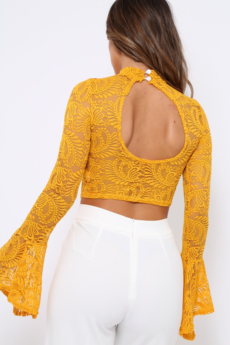 Lace is always more! And you can look more extra than ever in our Ellah Mustard Lace High Neck Crop Top with Key Hole Back. Featuring long sleeves, buttoning high neck, peep hole back and flared sleeves. This would look perfect paired with tailored trousers and high heels!